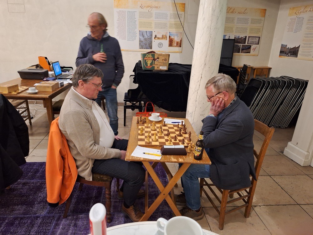 Doordat koploper Pieter Hofstee niet aanwezig was, werd Pearl Uyttenhove door de indelingscomputer met wit in staat gesteld om zijn nederlaag tegen Wim Platje eerder in deze competitie met gepaste revanche te beantwoorden. Na een Engelse Opening kreeg het spel kenmerken van het Koningsindisch. Bij de overgang naar het middenspel stonden er gelijkwaardige stellingen op het bord. Het ruilen van zijn zwartveldige loper voor een paard was geen goed idee van Wim. En ook een tweede ruil van een paard bracht geen verlichting. Een sterk pionnencentrum en het loperpaar brachten Pearl een uitstekende basis voor een veelbelovende aanval. Een tweetal pionnen op de e- en d-lijn werden door Pearl met grote precisie omgesmeed tot dodelijke wapens. Een dame-uitval van Wim werd door Pearl afgeweerd en heel laat in de avond, ondanks de materieel nog gelijke stand, gaf Wim op toen promotie niet meer kon worden voorkomen. (Pearl Uyttenhove - Wim Platje 1−0)