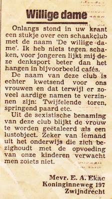 belangrijke clubjaar 1986. Aart, alias mevrouw Eckhart, vond de naam Willige Dame strijdig met de
