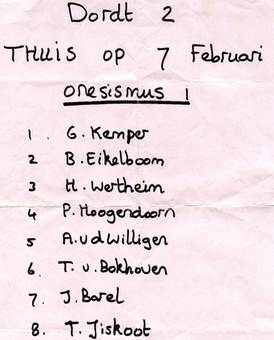 opstelling van Dordrecht 2 in 1989 14.01.08 Uitnodiging voor de RSB-wedstrijd tussen Dordrecht 2 en Onésimus 1 op 7 februari 1989. Het papier
