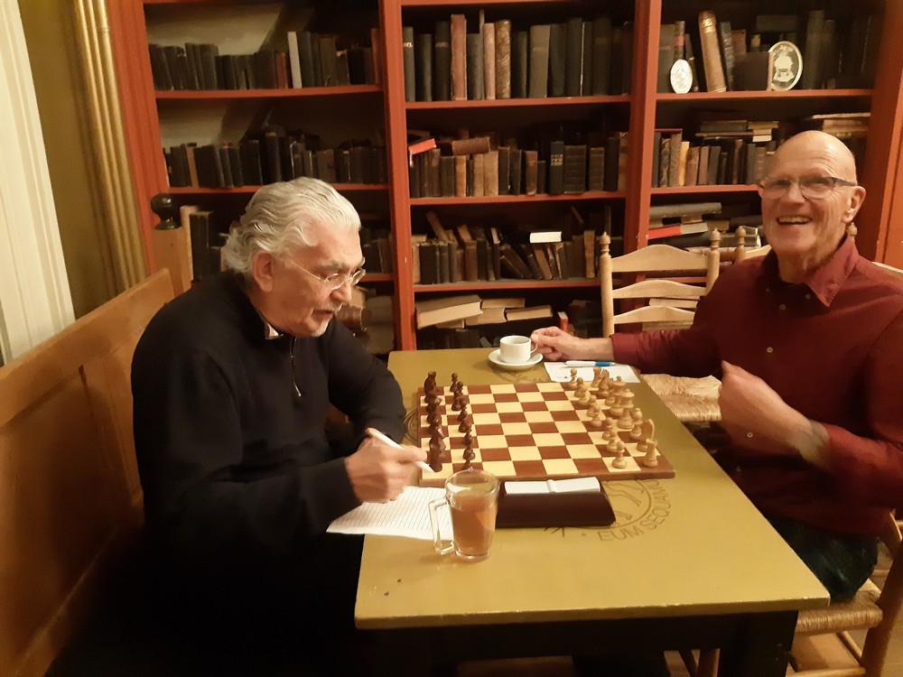 Zwart rokeert nu wel kort. Piet heeft weliswaar een gedekte vrijpion op b5 maar die kan hij niet met stukken ondersteunen. Na wat plaagstootjes weet Han zijn d- en e-pion op te spelen en dan is er geen houden aan. Een uitgeputte Piet geeft zich over. (Piet Schuller - Han van Gorkom 0−1)