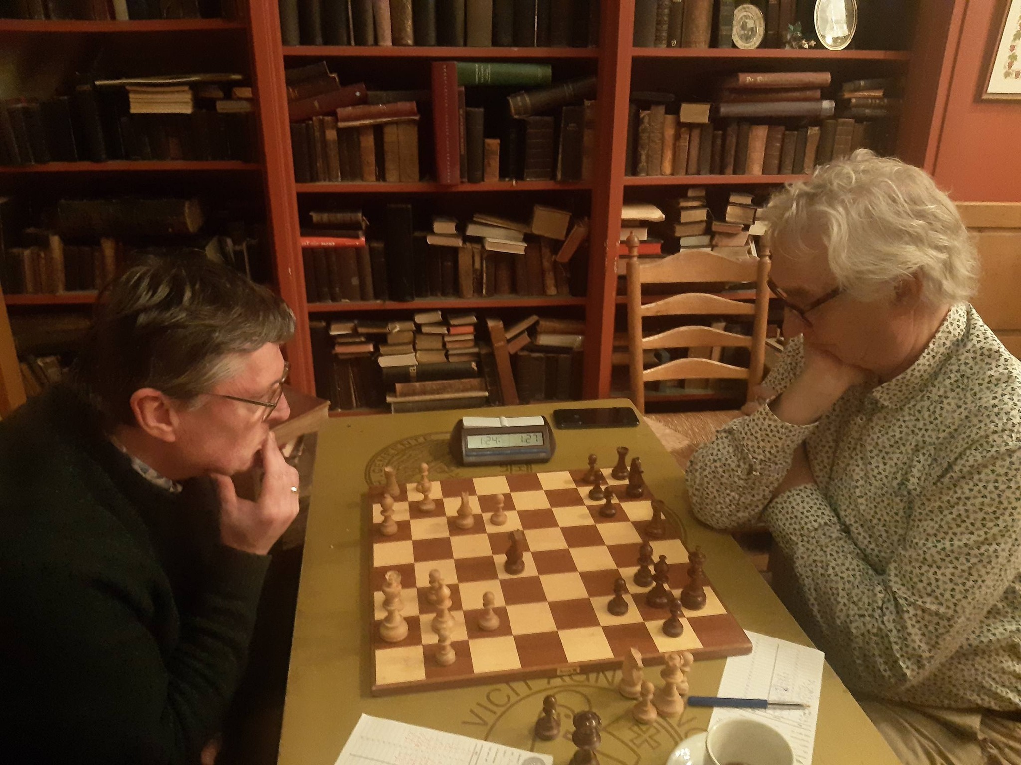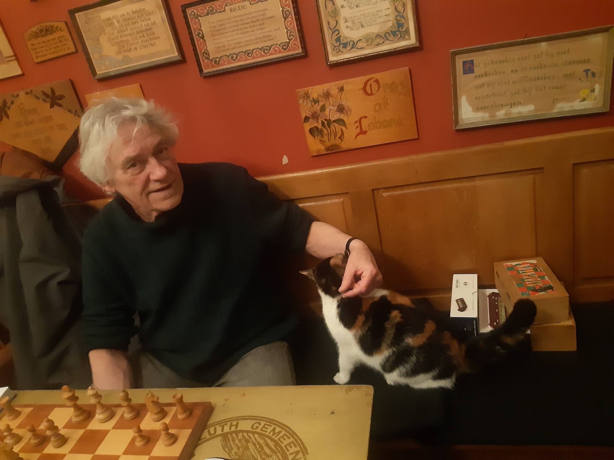 John van Waardenberg begon maar weer eens met 1.b4 en 2.Lb2. Op dat Pools-Sokolsky-Orang-Oetangeweld vond Cor Paans met 1..e5 en 2..d6 een goed antwoord. Opmerkelijk was dat in de opening alle vier de lopers werden gefianchetteerd. John richtte zijn pionnen en stukken in eerste instantie op de zwarte damevleugel, maar Cor legde daar de pionnenformaties vast. Toch kon John met een toren op a7 en een paard op a5 de zwarte stelling via de open a-lijn binnendringen. Daar werd door Cor echter sterk verdedigd. Het verdere verloop verliep zonder grote wederzijdse fouten zodat ook deze partij in remise eindigde. Zelfs de Geschaakte Kat bracht daar door zijn aanwezigheid geen verandering in aan.