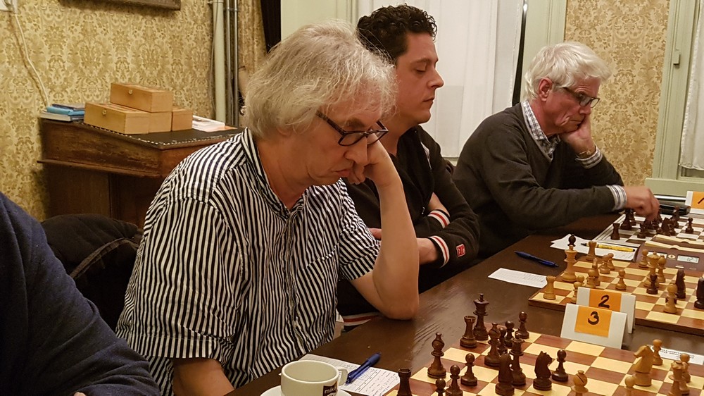 Dick Korteland en Jisk Liemburg hadden erg veel plezier tijdens hun partij. Wat aanvankelijk een "Kurzpartie" leek te worden werd toch een vermakelijke en van diepzinnige zetten vergeven potje zwoegschaak. Het zal beide spelers nogal wat hoofdbrekens hebben gekost en dat was ze na afloop dan ook aan te zien. Wat wel enigszins bevreemdend overkwam was het feit dat beide spelers niet alle zetten leken te hebben genoteerd. Dat zal er wel in het vuur van de strijd bij ingeschoten zijn. (Dick Korteland - Jisk Liemburg ½−½)