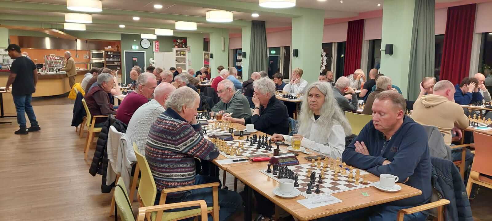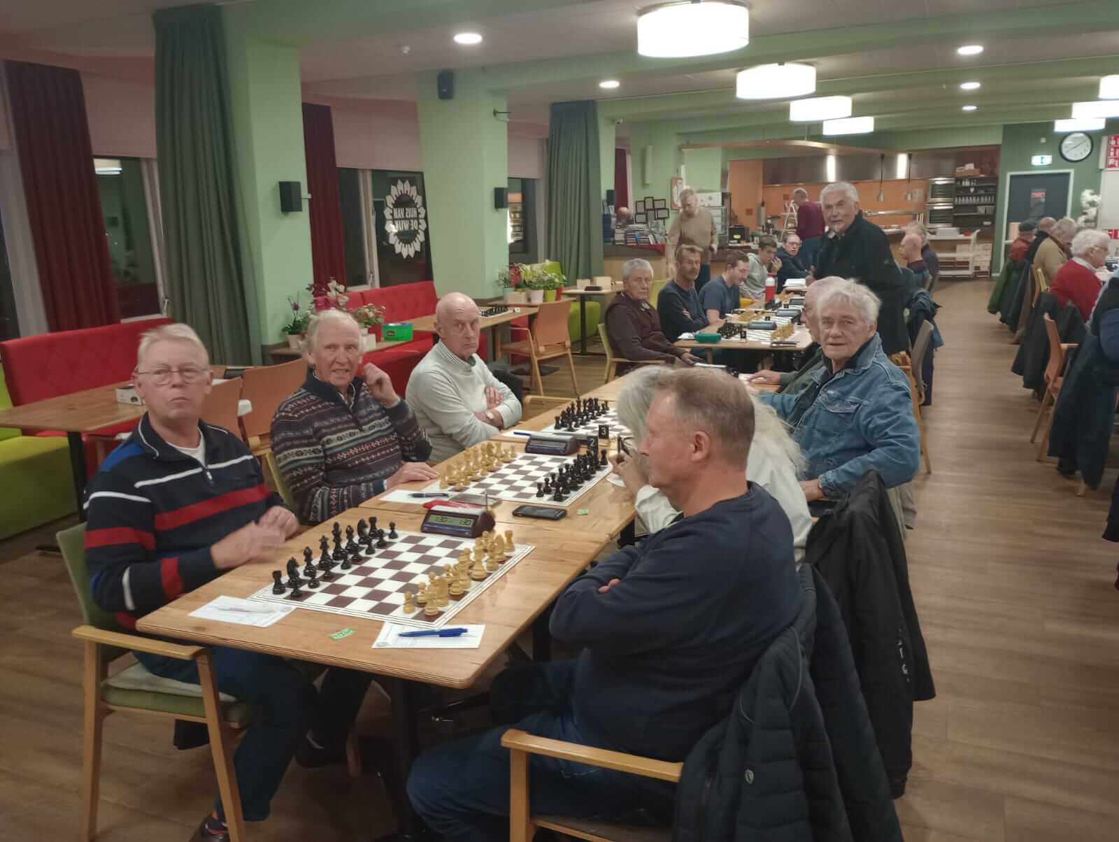Terug naar de schaakwedstrijd. Extern wedstrijdleider Aad van Dop heette ons welkom, vermeldde en-passant nog even dat smartphones én smartwatches op de speeltafel dienden te worden gelegd en na een echte gongslag kon de wedstrijd om acht uur van start gaan.