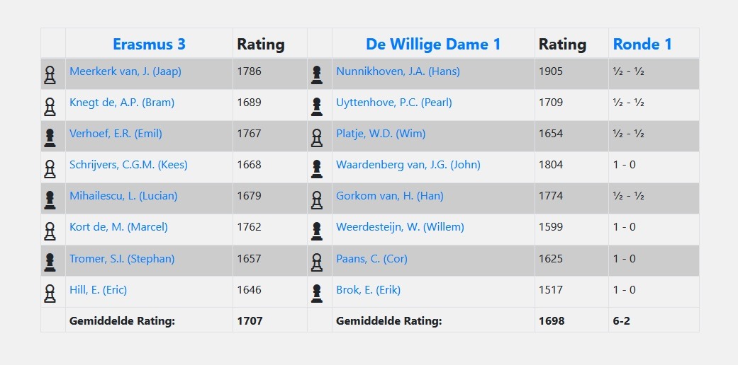 We zouden er naar het zich liet aanzien door diverse oorzaken niet in gaan slagen om op de vastgestelde datum een compleet team op de been te brengen. Maandag 22 september bleek voor de wedstrijd tegen het derde achttal van schaakvereniging Erasmus niet haalbaar. Na overleg met de tegenstander werd het uiteindelijk maandag 6 oktober.