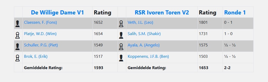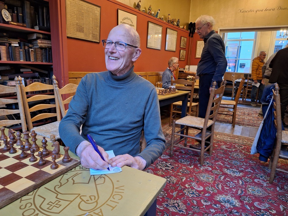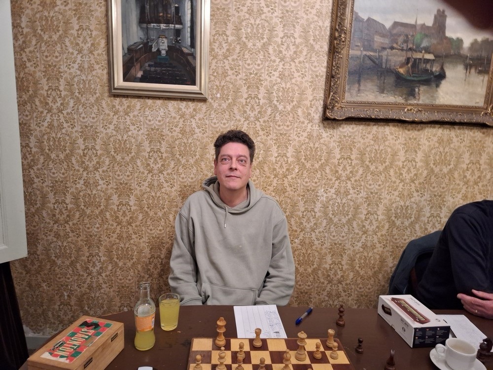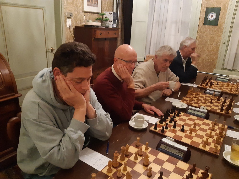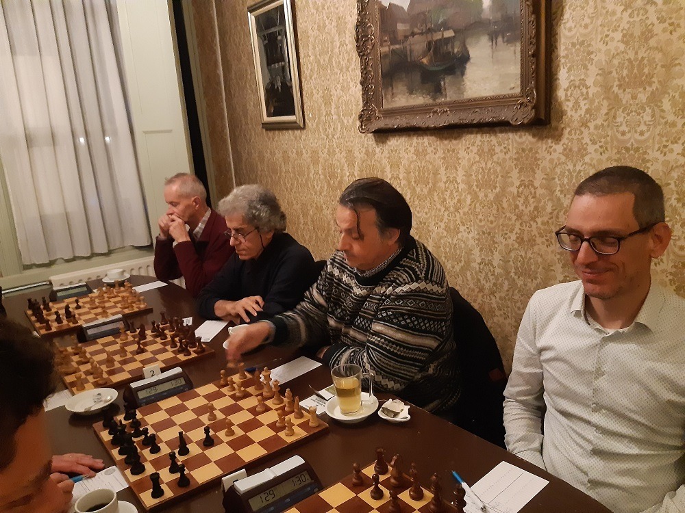 Op het vierde bord viel het tweede resultaat van de avond te noteren in de partij tussen Erik Brok en Ben Koppenens. Na Eriks 1.d4 ontstond een opening die wat weg had van het Londonsysteem doordat Erik 4.Lf4 op het bord zette, terwijl Ben koos voor de Koningsindische opzet met g6, Lg7 en Pf6 om zich te verdedigen. Met een pion of met de loper een paard terugslaan op e5 was de vraag die Erik nog in de opening moest beantwoorden. Erik sloeg met de loper. Slaan met de pion had hem met een kleine combinatie pionwinst en een mooie stelling opgeleverd. Even later had ook met een pion op e5 slaan Erik voordeel kunnen geven, maar in plaats daarvan was het Ben die even later een pion buitmaakte. Op zijn beurt pikte Erik er gelukkig ook eentje mee en nadat hij geen gebruik maakte van een penning, die hem een kwaliteit en misschien alsnog het volle pond had kunnen opleveren werd het voor beide spelers een tevreden remise. (Erik Brok - Ben Koppenens ½-½).