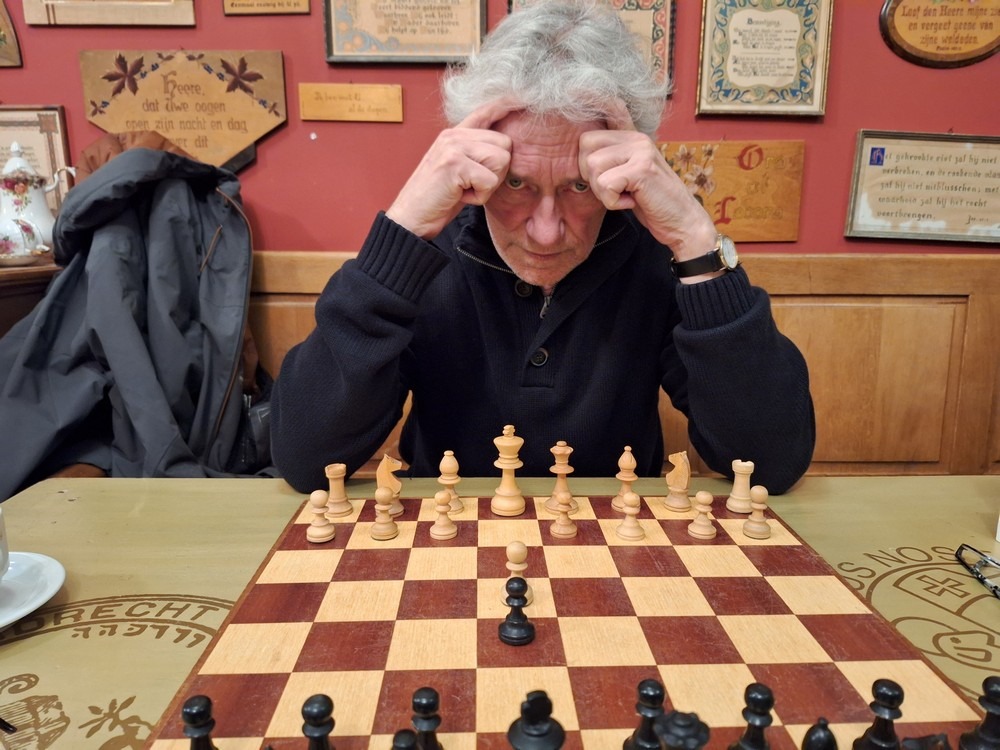 Het was aan Wim Platje om met wit op het eerste bord te spelen. Zijn tegenstander was Huig de Koning, die op 1.e4 van Wim er met 1...c5 een Siciliaan van maakte. Wim koos met 2.Pc3 Pc6 3.f4 voor de Grand-Prixvariant. In de opening was dan de ene, dan weer de andere speler licht in het voordeel. Er werd voorzichtig en behoedzaam gelaveerd. Het was Huig, die het eerst de fout inging, en meteen flink ook. Hij viel Wims dame aan, maar die onttrok zich daaraan met een schaak, waardoor Wim een loper won. Een stuk voorsprong is wel genoeg voor de overwinning zou je denken, maar zwart begon een wanhoopsactie met de e-, d- en c-pionnen. Wim had echt actiever moeten tegenspelen, maar dacht de pionnen-opmars wel te kunnen stuiten als ze eenmaal dichter waren genaderd. Op zich zou dat een goede strategie geweest kunnen zijn, maar hij had dan wel de e-pion moeten ruilen met zijn f-pion in plaats van hem er langs te laten glippen. Wel ruilde Wim de dames, altijd goed als je al een stuk voorstaat, maar wel ten koste van een extra pion. Nu kostte het veel denkwerk om de winstkansen levend te houden en dat leidde uiteindelijk tot een blunder door kortsluiting, waarbij Wim een loper weggaf. Remise leek haalbaar bij de inmiddels gelijke materiële verhoudingen, maar nog een grote fout van Wim dwong hem tot overgave. Als ik Wim was geweest zou ik me over zo'n schandalige vertoning diep hebben geschaamd. (Wim Platje - Huig de Koning 0-1)